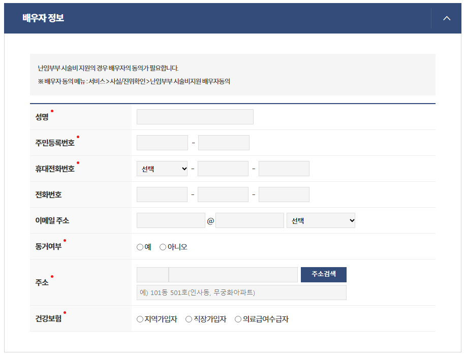 보건소를 직접 방문하는 것도 하나의 방법이지만 집과 병원에서 모두 보건소가 멀어 온라인으로 신청했어요. 우선 필요한 서류들은 전화로 물어봤고 전부 준비된 상태로 진행했어요. 혼인신고를 한 상태라면 서류가 병원발급해주는 것 하나만 있으면 되고 사실혼 관계라며 아마 관계증명서가 있어야 할 것 같아요. 그리고 온라인 접수라면 본인, 배우자 공인인증서는 가지고 있어야 한다는 점!