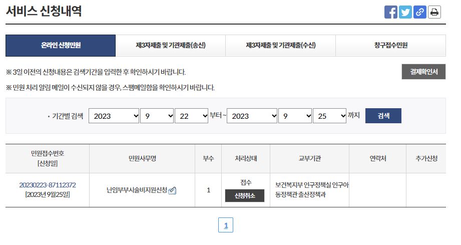 위의 순서대로 따라 신청했다면 아래 화면처럼 접수로 나올 거예요. 여기서 끝이 아니라 난임 부부 시술비 지원 신청에서 배우자 동의가 필요해요! 잊어버리면 안되는 부분~ 배우자 동의는 어떻게 하면 되는지 알려드릴게요.