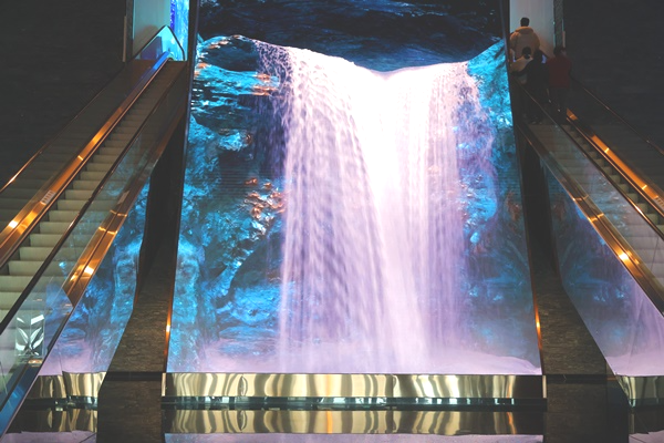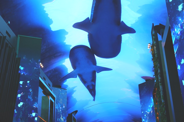 에스컬레이터를 타고 올라가면 보이는 오로라는 150M 엄청난 길이의 LED에 영상과 소리가 나오는 걸 볼 수 있어요. 비현실적인 느낌과 함께 이것 때문에 더 화려하게 느껴지는데 기존의 리조트 시설들과 달라 신비로움도 있었어요. 아침 8시부터 저녁 12시까지 운영되며 고래쇼는 매시 정각부터 30분 간격으로 시청 가능!
