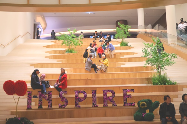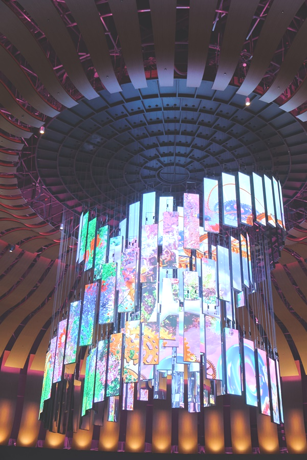 인스파이어 리조트 오로라 공간을 지나면 로툰다를 볼 수 있어요. 뒤 쪽으로는 아레나로 이어져 있고 시그니처 공간으로도 유명한데 키네틱 샹들리에가 눈을 사로잡았어요. 여기 주변으로는 팝업 행사가 열리기도 하고 CU편의점도 있어 사람들이 제일 많이 서성거리는 곳이었어요. 매시 15분과 45분에 짧은 미디어 아트 쇼를 구경할 수 있어요. 아레나에서 공연도 보게 된다면 영종도 실내 데이트 코스로 적합하다고 생각돼요.
