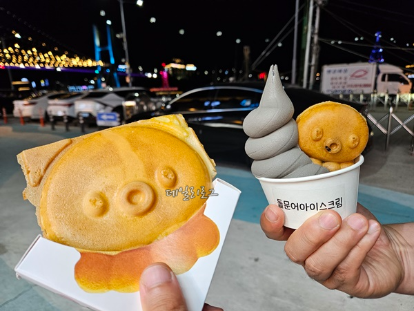 여수 야경 명소 구경하다가 발견한 돌문어빵과 아이스크림! 너무 귀여워서 무조건 먹어야겠다고 사 먹었는데 현금이 없어서 계좌이체로 대신했어요. 돌문어빵 가격은 3,000원이었고 돌문어아이스크림은 4,500원이었어요. 다른 음료 메뉴도 있고 선물용도 있었어요. 돌문어빵은 모차렐라치즈에 크림치즈, 연유가 포함돼 달달함이 맛있었고 바닐라아이스크림에 먹물 한 방울과 함께 팥이 들어있는 문어빵도 맛있었어요. 아이스크림에 찍어먹으니 더 꿀맛이었던!!!!