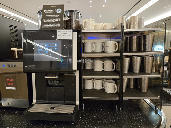 인천공항 제2터미널 마티나 라운지에는 생맥주랑 와인도 있었어요. 무제한으로 즐길 수 있으며 와인은 전용 냉장고가 따로 있어 꺼내서 컵에 따르면 돼요. 와인병은 자리로 가져갈 수 없으니 꼭 지켜주세요! 커피 머신도 RA인증을 받은 것으로 에스프레소, 아메리카노, 카페라테, 카푸치노, 우유스팀을 선택할 수 있어요. 직관적이어서 좋았고 얼음을 따로 가져와서 아이스로 마실 수 있는 점이 제일 좋았네요.
