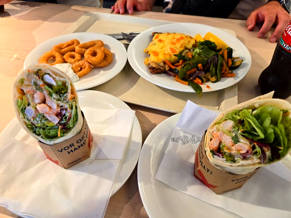 인솔자님과 일행들을 만나기 전 점심도 해결해야 했기에 고민하다가 노드씨 샌드위치로 선택했어요. 노드씨는 오스트리아 전역에 걸쳐 있는 가성비 맛집이고 생선이 주 메뉴인 곳이에요. 오징어링과 새우 샌드위치, 치즈가 올려진 이름 모를 생선까지 주문하고 콜라 2잔도 같이 곁들였어요. 직접 눈으로 보고 고를 수 있어 편하게 주문할 수 있지만 뭔가 물어보기엔 직원도 우리도 짧은 영어라 소통 불가.