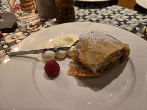 식전에 나온 수프부터 블루베리소스에 찍어 먹는 슈니첼, 달달함의 끝판왕이었던 디저트까지 양이 엄청 많아 배부르게 먹었어요. 슈니첼을 남겼다는 게 제일 슬픈 이야기ㅠㅠ 얇은 튀김옷의 바삭거림에 블루베리소스의 달달함이 너무 잘 어울렸어요. 여기만의 방식인 블루베리 소스 얘기를 듣기만 했을 땐 상상되지 않았는데 막상 먹어보니 엄청 맛있어서 계속 먹게 되는 맛이었어요.