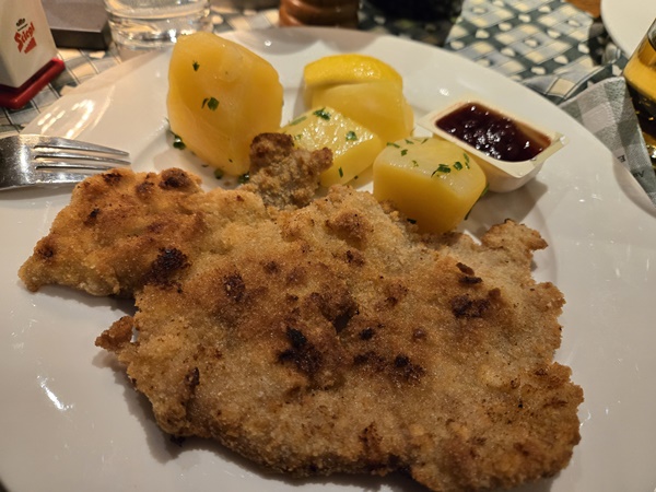 영화가 끝나고 잠시 휴식시간 뒤 어느샌가 도착한 PitterKeller 레스토랑! 오늘 저녁은 슈니첼을 먹는 날이어서 살짝 기대감이 높아졌는데 디저트까지 맛있게 먹고 나왔어요. 슈니첼은 망치로 두들겨 연하게 만든 고기에 튀김옷을 입혀 만든 요리로 우리나라랑 비교하자면 돈가스와 비슷한 느낌이에요. 그것보다는 좀 더 얇은 편이지만 ㅎㅎ