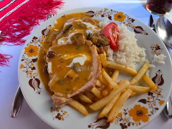 굴라쉬가 메인은 아니었지만 꽤나 맛있었어요. 파프리카 가루를 넣어 먹어도 괜찮다고 했는데 저는 그냥 먹는 게 더 나았어요. 개인 취향에 따라 조금씩 다른 듯..... 메인 메뉴로 나온 고기는 소스가 조금 짜게 느껴졌지만 감자튀김과 곁들여 먹으니 훨씬 맛있었어요. 마지막 아이스크림까지 완벽한 점심식사였어요.