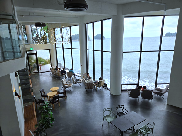 시원한 바닷가 몽돌해변 구경도 하고 다시 올라오면서 카페를 둘러보니 늦은 시간이 되어서 사람들이 많이 빠져있었어요. 그래서인지 더 카페 규모가 크게 느껴졌어요. 오션뷰 카페 라피끄의 진짜 매력은 햇빛 쨍하게 뜨는 날 통창 너머로 보이는 바다예요. 오늘은 너무 아쉬웠지만 언젠가 다시 여수를 오게 된다면 또 들리고 싶은 카페였어요.