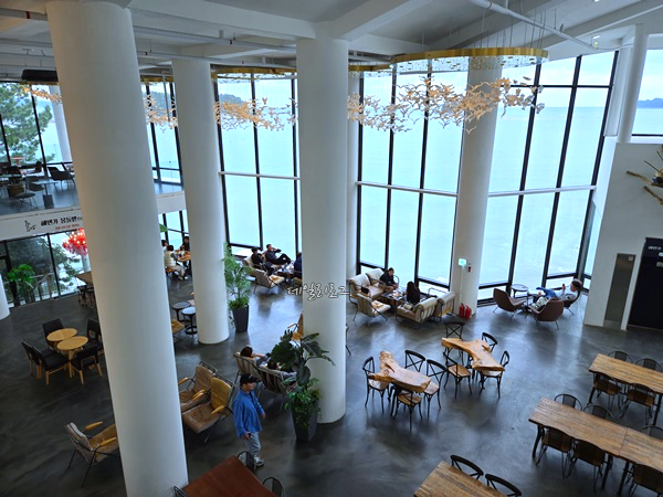 사람이 워낙 많아서 오전에 오픈런을 하던지 차라리 늦게 가는 게 나은 것 같아요. 저희는 평일 오후에 도착했던터라 3시 조금 넘어서 들어갔는데 자리가 있었어요. 창가 자리는 전부 가득 차있었고 안쪽자리만 남아 먼저 자리를 잡았어요. 여수 대형 카페 라피끄는 예술랜드 쪽에서 바라봤을 때는 규모를 가늠할 수 없는데 해변가로 나왔을 때 보면 엄청 크다는 걸 알 수 있었어요.