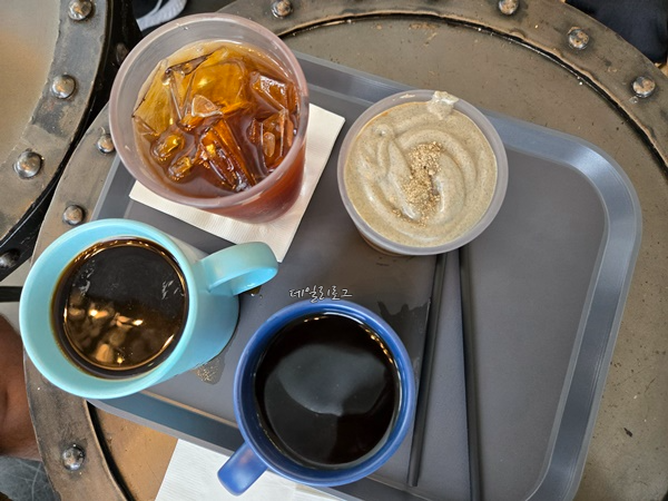 같이 갔던 2명은 자리 잡으러 내려갔고 저랑 짝꿍은 기다려서 커피를 받아갔어요. 케이크나 빵 종류도 구매할까 하다가 배도 부르고 디저트들이 이미 많이 팔려서 몇 개 없어서 고르지 못했어요. 아메리카노 3개와 시그니처 음료를 주문했는데 전부 다 맛이 좋았어요. 시그니처 메뉴는 계속 마시다 보면 느끼함이 좀 있었지만 대체적으로 맛이 좋아 시원했어요.