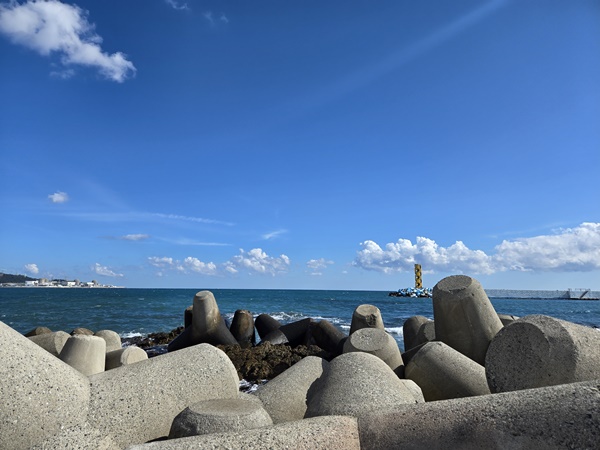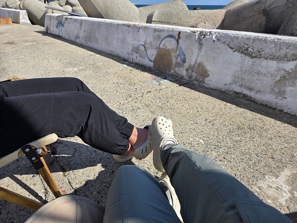 캠핑 의자와 테이블 세팅하고 차에 에어매트와 포장해 온 커피, 편의점에서 사 온 과자, 대용량 배터리까지 놓아두고 나니 집에서 쉬는 거랑 다를 바 없는 느낌이었어요. 따뜻한 햇살에 주기적으로 들리는 파도 소리, 선선하지만 살짝 차가운 바람까지 완벽했어요. 잠깐 누워있는다는 게 순간적으로 잠들었는데 짧은 시간에 깊게 잠들었어요. 나중에는 바람이 좀 춥게 느껴져서 가져갔던 담요 덮었더니 따뜻해서 좋았어요.