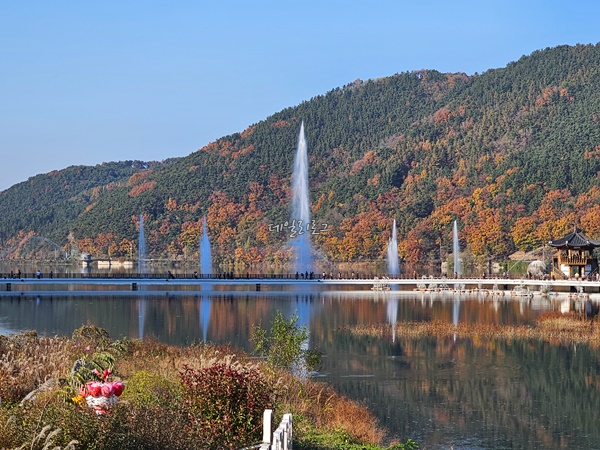 호수 위에 올려진 나무 데크길을 따라 걸으며 반대편의 풍경을 바라본건데 맑은 호수에 비친 잔상이 너무 예쁘지 않나요? 감성적이지 않은 사람들도 걷다 보면 감성적이 될 것 같은 풍경들이에요. 옥연지 송해공원 둘레길이 3.5km 정도 된다고 하니 이런 풍경, 저런 풍경, 중간에 오리들과 분수쇼도 구경하다 보면 시간이 금방 흘러가요.