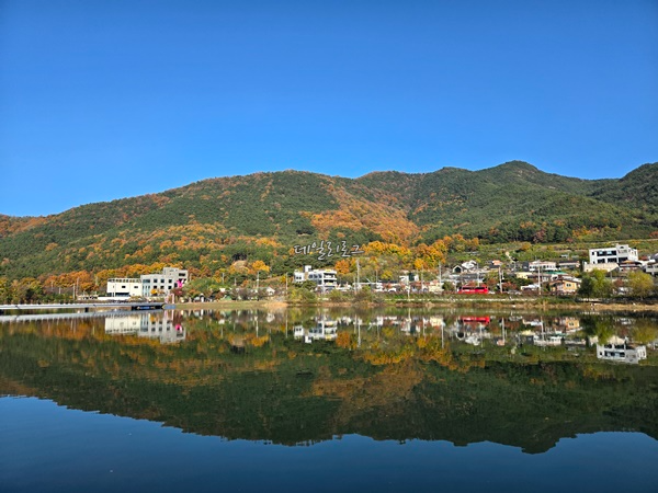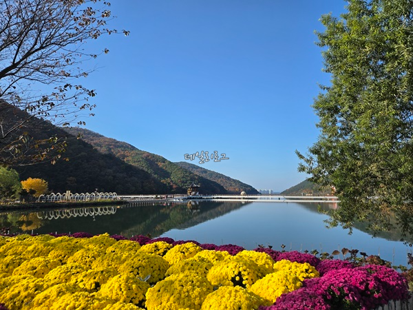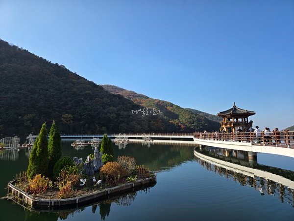 호수 위에 올려진 나무 데크길을 따라 걸으며 반대편의 풍경을 바라본건데 맑은 호수에 비친 잔상이 너무 예쁘지 않나요? 감성적이지 않은 사람들도 걷다 보면 감성적이 될 것 같은 풍경들이에요. 옥연지 송해공원 둘레길이 3.5km 정도 된다고 하니 이런 풍경, 저런 풍경, 중간에 오리들과 분수쇼도 구경하다 보면 시간이 금방 흘러가요.
