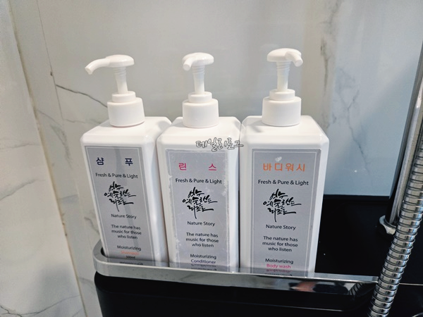 여수 예술랜드 리조트 복층 숙소에는 각 층마다 화장실이 따로 있지만 똑같은 구조여서 한 번에 보여드리려고요. 세면대는 외부에 있고 여닫이로 되어있는 화장실이며 샴푸, 린스, 바디워시가 있는 샤워공간과 비데가 있는 변기만 있어요. 처음엔 수건이 어딨는지 몰라서 이리저리 둘러봤는데 2층은 세면대에 있고 1층은 냉장고 옆 수납장 위에 있었어요.