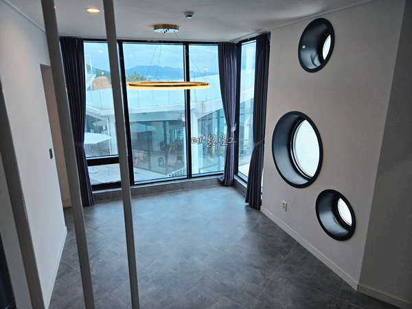 여수 예술랜드 리조트 장군도 201호는 들어온 곳이 바로 2층이며 어디서든 바다가 보여 시원했어요. 거실에 있는 동그란 창문은 배를 타고 있는 느낌이 들었고 커튼월로 큰 창문이 가득해서 좋았어요. 다만 밤에는 깜깜해서 아무것도 보이지 않아 약간 무섭다는 생각이 들기도 했던...
