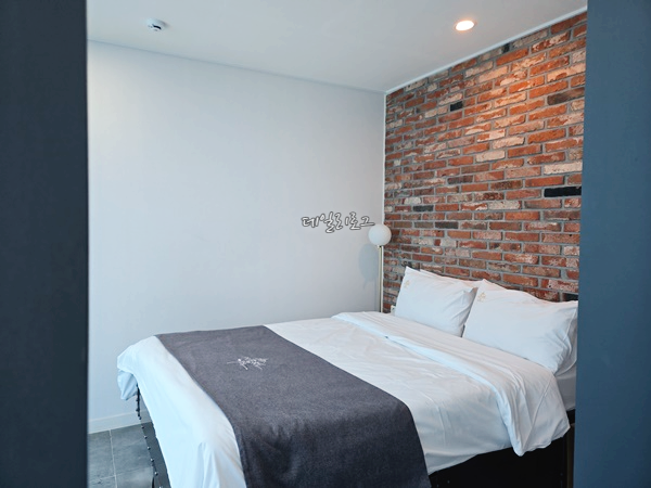 2층에 있는 더블침대 하나만 있어 좁게 느껴질 수 있지만 대형창문 덕분에 개방감이 좋았어요. 침대에 누워서 바다와 하늘을 볼 수 있다는 게 가장 큰 장점이었고 아침에 햇빛이 많이 들어오지 않았지만 혹시 몰라서 커튼을 반만 닫고 잤어요. 작은 협탁과 콘센트가 있어 핸드폰 충전이 가능하니 충전기 챙겨가셔요! 개인적으로 잘 때 문을 닫고 자는 스타일인데 2층 침실의 문은 여닫이로 완전하게 닫히지 않아 잘 때 살짝 신경이 쓰였어요.