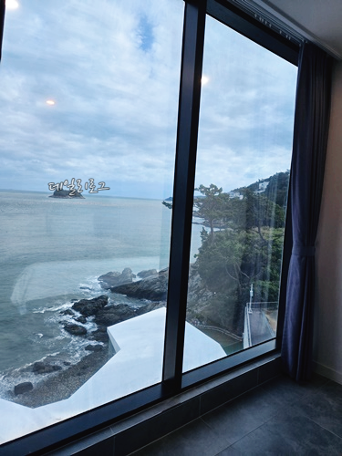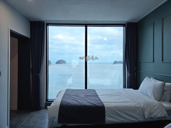 침실은 2층보다 넓은 공간으로 화장대와 옷장, TV까지 있었어요. 침대는 싱글이라기엔 조금 넓고 더블이라기엔 조금 작은 침대가 2개 있어요. 넓은 공간에 대형 창문까지 오션뷰를 생각한 침실에 딱 어울리는 분위기였어요. TMI지만 저희는 2층을 사용하고 엄마아빠는 1층을 이용했는데 원하는 드라마가 달라서 야식 먹을 땐 따로 봤어요. 너무 좋은 장점!