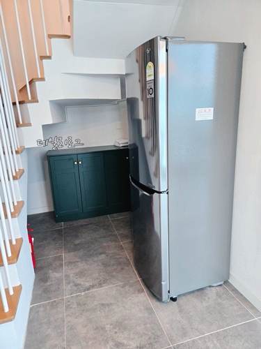 1층으로 내려가는 계단은 조금 높은 편이었고 계단참 없이 연결되어져 남녀노소 모두 주의해야 돼요. 아이들이 걱정된다면 여수 예술랜드 리조트 예약하실 때 단층으로 된 룸을 선택하시는 것도 좋아요. 계단 아랫 공간에는 층에 없었던 냉장고가 있었는데 처음엔 이걸 몰라서 외부 테라스 쪽에 과일이랑 음료를 놔두었어요. 불편하지만 시원하게 먹으려면 계단 운동하시길!
