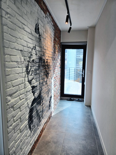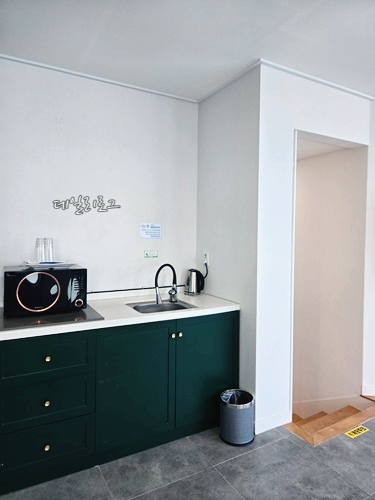 싱크대와 전자렌지, 커피포트만 있어요. 외부 음식을 사서 먹기에 적당했기에 여수에서 유명한 찰밥과 멸치, 돌게빵 등을 사 와서 저녁을 먹었어요. 컵라면도 곁들여 먹은 건 안 비밀. 무엇보다 전자레인지가 있으니까 밥을 데워먹기에 좋았어요. 아! 참고로 식기류 및 수저는 없으니 챙겨 오셔야 해요. 컵도 있지만 저희는 종이컵 이용했어요. 부엌 공간 옆에는 1층으로 내려갈 수 있는 계단이 있고 창문 옆의 오픈된 공간은 화장실이었어요. 화장실은 손 씻는 공간만 밖으로 나와있어요.