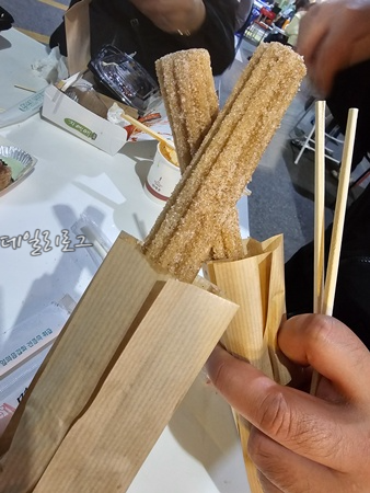 마지막 입가심으로 뭘 먹을까 하다가 간단하게 추로스랑 슬러시 하나 먹었어요. 이거까지 다 먹고 나니까 배가 어찌나 불렀는지.... 진짜 밥 먹으러 온 느낌으로 먹었는데 주변에 보니까 저희 같은 사람은 없었어요ㅠ 다들 여유롭게 2차 느낌으로 먹던데 다음에 칠성야시장 가면 저희도 그렇게 해보려고요. 그래도 후회 없이 커피까지 다 먹고 끝냈어요.