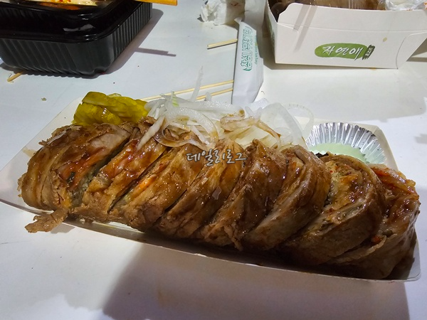 제일 최고로 느끼했던 삼겹야채뚱말이. 삼겹김밥 같은 느낌으로 속에 있는 야채들의 조합은 좋은데 제가 야채를 좋아하지 않아서 불호에 가까웠어요. 오징어순대 같은 비주얼에 양이 엄청 푸짐해서 하나 주문해서 둘이 먹어도 배가 찰 정도였어요. 양파에 고추냉이까지 잘 먹는 분들에게는 정말 추천드리는 음식!