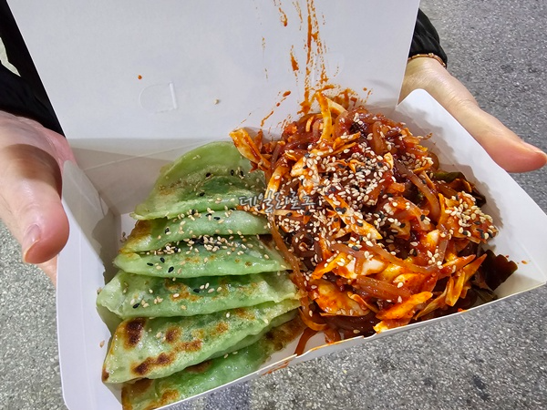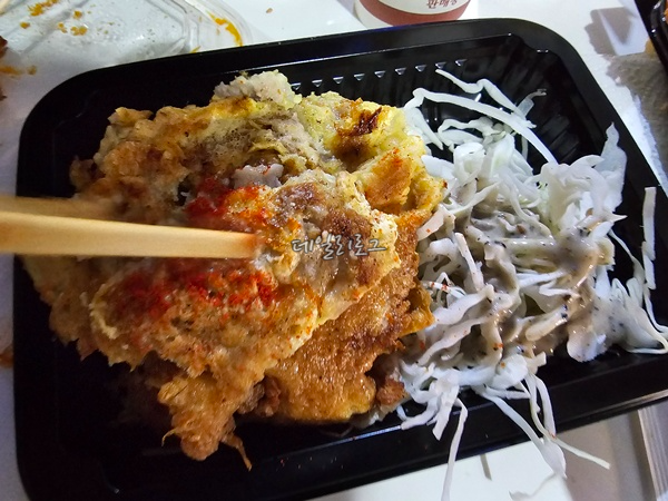 중간쯤 고민하다가 사 먹은 육전! 오~육전 매대에서 판매하는데 정말 생각지도 않았던 육전이라서 기대감 없이 먹은 거라고 해도 엄청 맛있었어요. 느끼하거나 질기지 않은 식감이 좋았고 양배추 샐러드와도 너무 잘 어울렸어요. 육전이 다 거기서 거기라는 생각이 든다면 꼭 한 번 사 먹어 보세요. 후회하지 않으실 거예요.