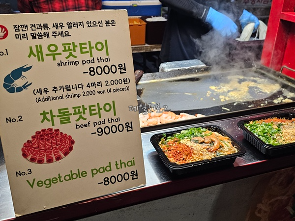 서문야시장이 7시에 오픈하자마자 줄 서서 차돌팟타이 사 왔어요. 차돌박이로 주문했는데 기다리는 동안 어찌나 냄새가 맛있게 느껴지는지 고통이었어요ㅠ 시간이 조금 걸려서 스테이크도 주문해서 같이 받아와서 먹었는데 팟타이는 정말 단연 최고였고 스테이크는 호불호가 있어서 아래에서 다시 적을게요. 팟타이는 금액에 비해 양도 푸짐해서 여러 가지 사 먹는다면 4명이서 1개 먹어도 충분할 정도예요. 소스부터 면까지 어느 것 하나 빠지지 않는 맛. 꼭 드셔보세요.