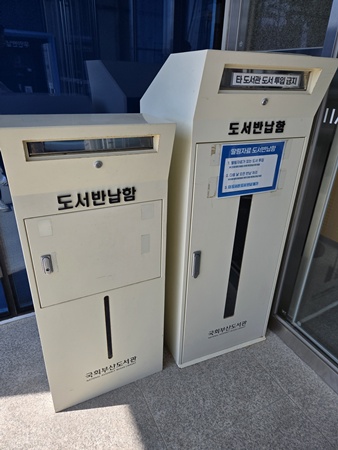 양쪽으로 위치한 도서반납함과 무인반납기. 아직 이용해 보지 않아 낯설지만 설명이 잘 나와있어서 그대로 따라 하면 돼요. 무인반납기의 경우 24시간 작동하는 것 같은데 새벽 3시부터 4시 사이에는 프로그램 재시작 때문에 이용할 수 없어요. 그럴 땐 반대편 도서반납함을 이용하시면 돼요. 물론 타 도서관 도서는 반납 안된다는 점!