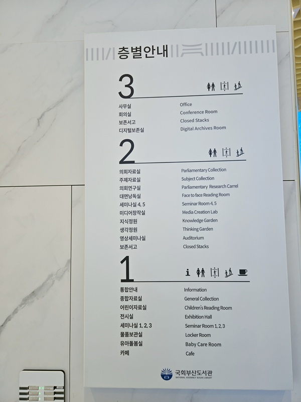 부산 국회 도서관은 총 3개의 층으로 만들어졌어요. 1층은 종합자료실, 어린이자료실, 전시실, 세미나실, 물품보관함, 카페가 있고 2층에는 좀 더 세부적으로 의회자료실, 주제자료실, 대면낭독실, 미디어창작실, 보존서고, 정원이 있어요. 3층은 출입 카드가 있어야 엘리베이터에서 누를 수 있어요. 아마도 안내데스크에서 먼저 확인을 받아야 하는 것 같아요. 사무실과 회의실, 보존서고와 디지털보존실이 있다고 하네요.