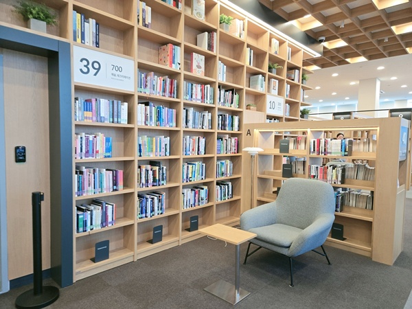 주제 자료실에도 방대한 자료들이 많았어요. 1층보다는 조금 더 분야별로 만들어져 있고 사이마다 편한 좌석, 테이블 좌석들이 있어 어디든 앉아서 책을 볼 수 있는 게 장점이었어요. 높은 곳에 있는 책을 위해 파트별로 사다리가 배치되어 있고 반납대도 쉽게 눈에 띄어서 활용도를 높였어요. 외부에 나갈 수 있는 곳이 두 군데가 있었는데 거기서도 책을 보는 사람이 있었어요. 아마도 답답하고 너무 조용한 공간보다 시원한 공기가 필요한 분들이었을듯해요.