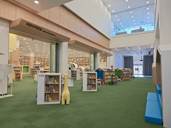 어린이 자료실도 어찌나 큰지 깜짝 놀랐어요. 아이들에게 맞는 의자와 흥미를 느낄 수 있는 디자인에 매료될 것 같아요. 책을 보는 걸 힘들어하는 아이들도 다양한 공간에 책 하나 놔두면 한 권정도는 재밌게 보겠다 싶었어요. 어린이 자료실과 카페 사이에 여러 좌석들에서 가족들끼리 앉아 책을 보면 너무 좋을 것 같아요.