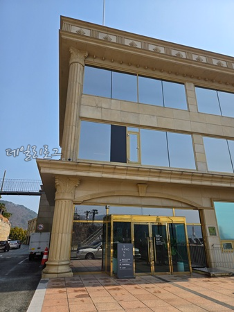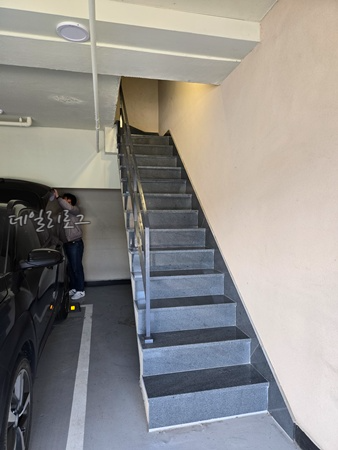 1208호로 배정받고 건물을 한바퀴 돌아 내려오면 사진처럼 주차가 가능해요. 거제 감성 숙소 호텔 상상은 1 객실 1주차는 무조건 가능하니 맘에 들었고 2대부터는 예약할 때 물어보면 돼요. 저희 앞쪽 객실에는 차가 2대였는데 주차장에 1대를 넣고 앞에 1대를 주차했는데 차 통행이 불편하진 않았어요.