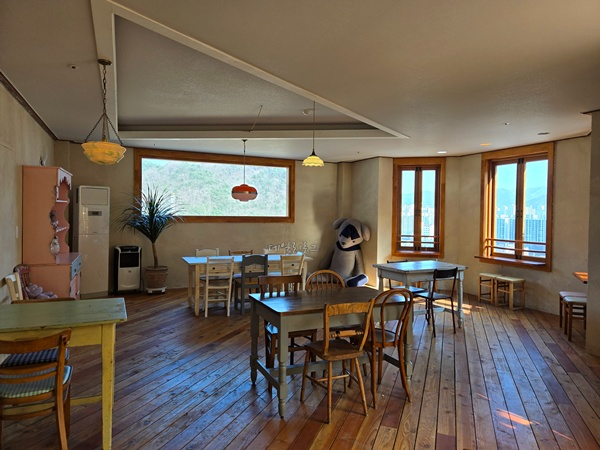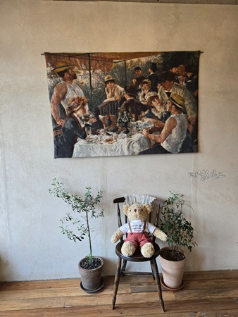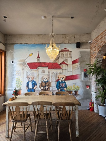 복도 끝에서 왼쪽으로 들어오면 더 예쁜 공간을 만날 수 있어요. 여기도 단체석과 4인석 테이블이 있었는데 포토존이 넘 예뻐서 저희는 여기에 앉았어요. 커피 마시면서 묘한 시선이 느껴져서 둘러보다가 전등에 앉혀진 곰인형이라는 거 보고 빵 터졌어요. 생각지 못한 곳에 인형이 있다니....