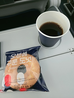 에어프레미아 이코노미에는 줄이어폰과 구운도넛, 커피 한 잔 마실 수 있어요. 구운 도넛 안 드시는 분들 꽤 있으시던데 제 취향에 딱 맞아서 신랑 꺼까지 뺏어먹었어요. 커피, 주스, 티 등 마시는 건 선택 가능해요. 그리고 줄 이어폰은 소리가 잘 안들려요. 원래 그런 건지 모르겠는데 영화 소리를 아무리 키워도(자막도 없어서) 잘 들리지 않아서 중간에 껐어요ㅠ