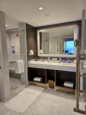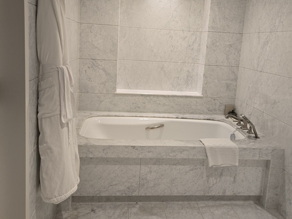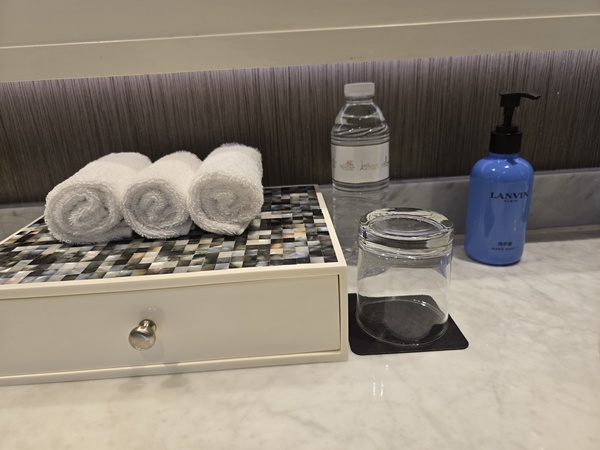 제일 놀라웠던 크기의 화장실이에요. 욕실이라고 말할 수 있을 만큼 큰 욕조와 2개의 세면대, 랑방 제품으로 가득한 어메니티까지 너무 만족스러웠어요. 소소한 부분에서도 고급진 느낌이 가득했는데 특이했던 건 욕실에 왜 물을 2개씩이나 나뒀을까, 하는 부분이었어요. 욕조에서 목욕하면서 한 병 마셨는데 그렇게 쓰라는 의미였을까요..