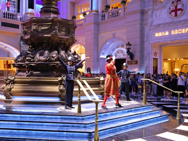 런더너 호텔의 메인 로비는 베네시안 호텔에서 넘어와 에스컬레이터를 이용해서 1층으로 와야 해요. 에스컬레이터 내려서 안내 표지판에 메인 로비 혹은 호텔 로비라고 적혀있는 방향으로 가면 근위병 교대식 위치에 도착할 수 있어요.