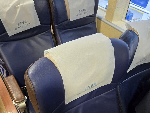 홍콩 마카오 페리 터미널에서 탑승한 코타이젯은 비바람 치는 날인 덕분에 길을 따라 내려갈 때는 몰랐는데 배에 들어서자마자 느껴지는 흔들림에 당황했어요. 멀미약을 먹은 게 정말 다행이라 생각됐던 순간이었죠. 나중에 알고보니 멀미 걱정하는 분들은 창가자리가 아닌 복도로 앉으면 된다고 하네요.