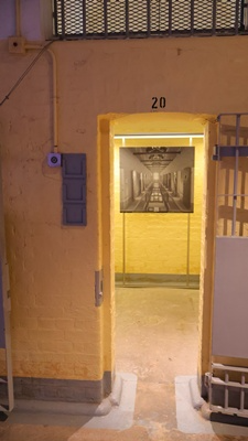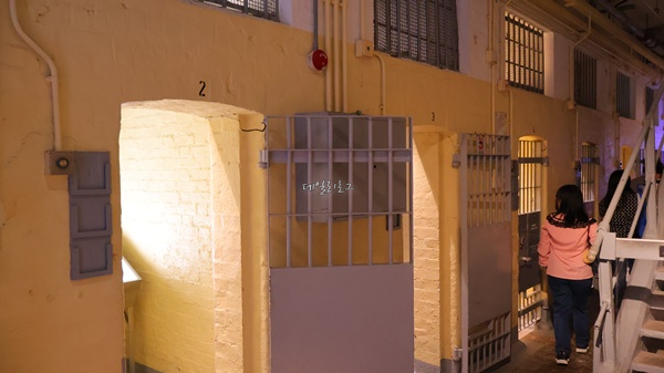 옛 죄수들은 이렇게 좁은 공간에서 지냈을까, 공간 자체가 작아 복도는 한 사람씩 지나다닐 수 있었어요. 중앙 계단은 출입금지라 이용하지 못하니 양쪽 복도로 이어져있는 실들을 구경하면 돼요. 수감동 하나씩 현대적인 예술로 바꿔놓기도 했고 문이 닫혀 틈새로 봐야 하는 공간도 있었어요.