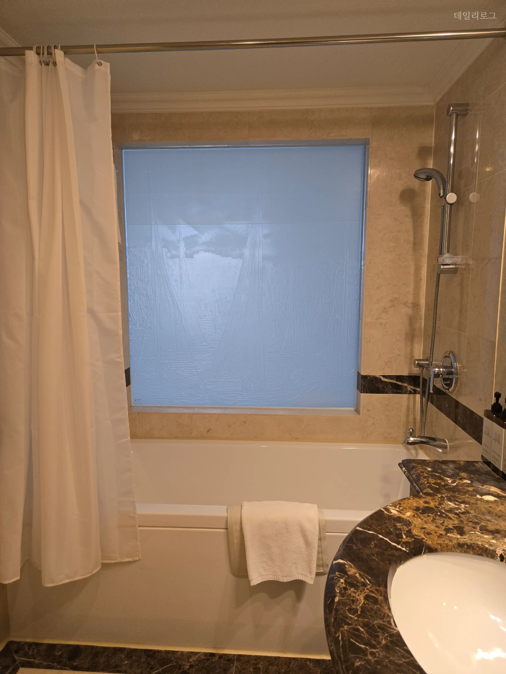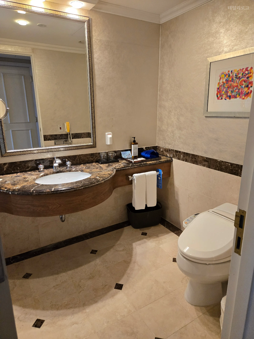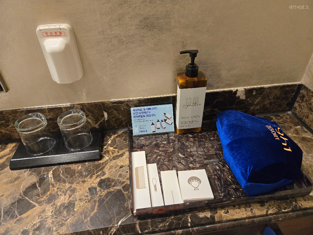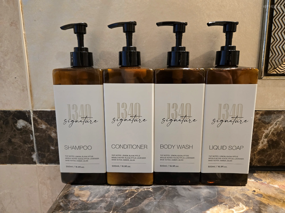 그랜드호텔 메인타워 스탠다드 투 더블룸의 화장실도 룸 크기에 맞게 큰 편으로 올드한 인테리어지만 그 자체로 고급스러운 느낌도 들곤 해요. 빗, 면봉, 드라이기와 같은 기본적인 어메니티는 갖춰져 있고 어느샌가부터 일회용 어메니티가 없어지고 이렇게 대용량으로 바뀌어졌어요. 호텔이라 믿고 사용하긴 하지만 찝찝한 분들은 개인적으로 가져 다니면 좋을 것 같아요. 다음엔 컨벤션타워에 숙박하게 된다면 또 후기 들고 올게요.