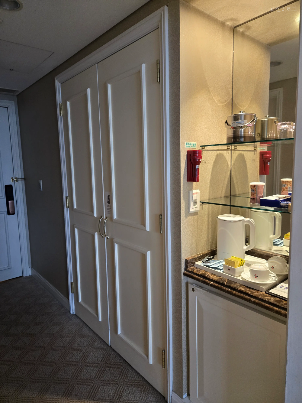 들어오자마자 보이는 드레스룸 코너에는 목욕가운이 있고 빨래건조대와 넉넉한 옷걸이가 있어요. 저희는 여행다닐 때 옷걸이를 가져 다니는 편인데 이번에는 사용하지 않아도 괜찮았어요. 그리고 그 옆에 있는 셀프바에는 유료 간식과 전기포트, 웰컴티, 커피 등이 있어요. 아래쪽 냉장고에는 무료생수도 포함되어 있으니 잊지 말기!