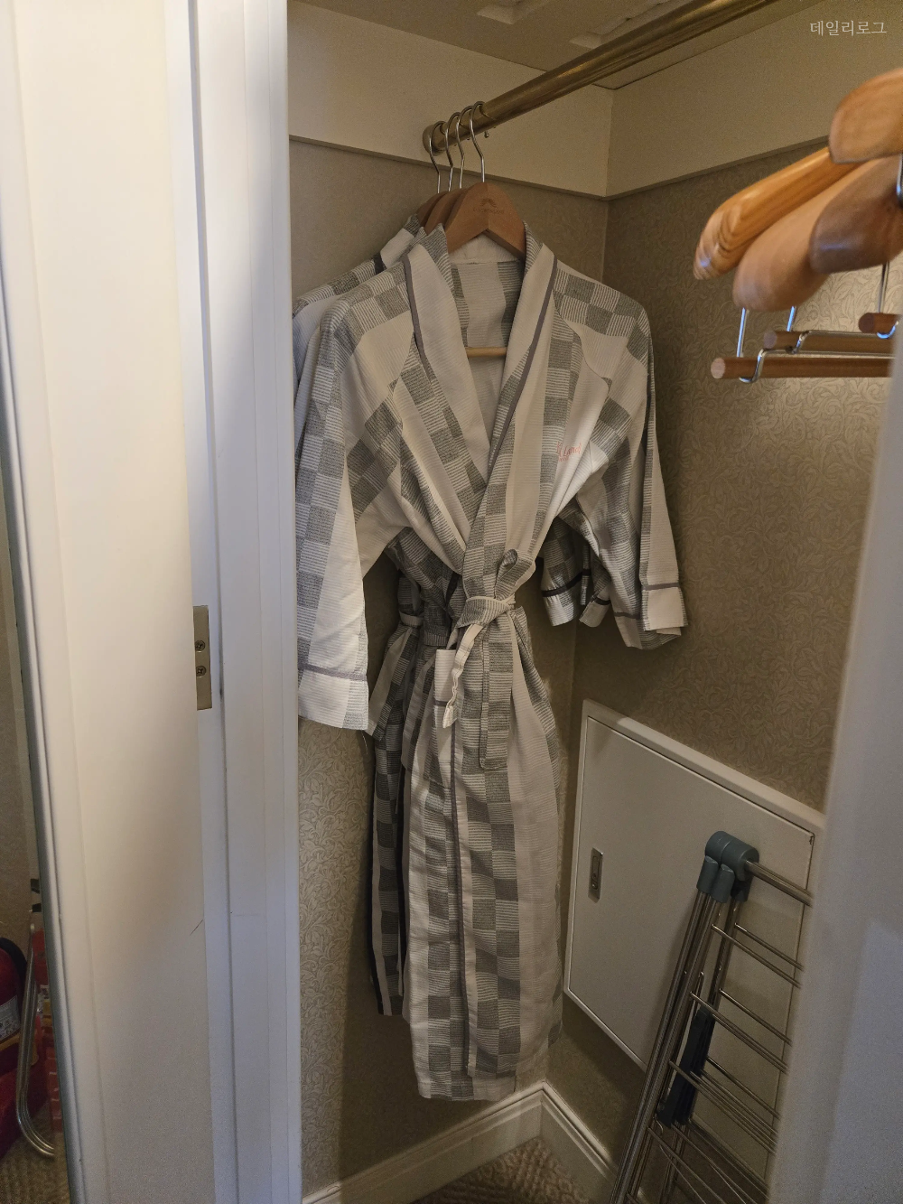 그랜드호텔 메인타워 스탠다드 투 더블룸을 포함한 모든 객실에 무료 생수가 비치되어 있고 슬리퍼도 인원수에 맞춰 있어요. 슬리퍼가 꽤나 포근하고 부드러워서 맘에 들어요. 은근 튼튼해서 찢기지 않는 게 제일 큰 장점! 드레스룸 안에는 다리미도 있으니 사용하실 분들은 참고하셔요.