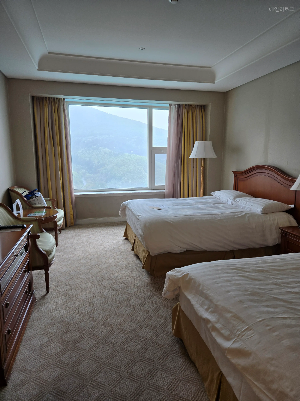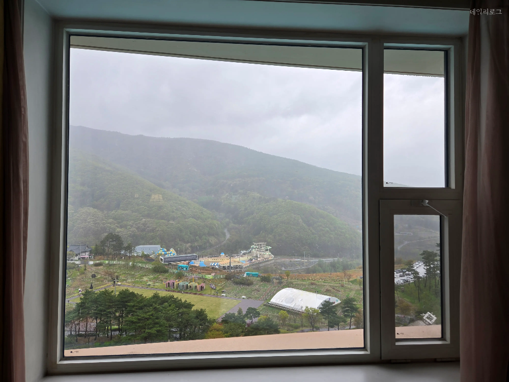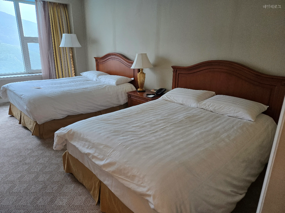 1년에 한 번쯤은 가족들과 함께 놀러 가는 편인데 이번에는 스탠다드 투 더블 객실을 선택했어요. 기준 인원이 4명이어서 더블 침대가 2개 있는 객실이었어요. 뷰는 메인 잔디광장을 보고 있는 객실이어서 눈이 정화되는 느낌~ 날씨가 조금만 더 좋았다면 하는 바람이 남아있었는데 다음날 일어나니 엄청 맑은 하늘에 기분이 좋아졌어요.