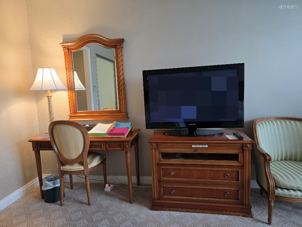 그랜드호텔 메인타워 스탠다드 투 더블룸은 4명이 사용하기에 적합한 넓이였어요. 창문 쪽으로 캐리어 2개를 펼쳐놓으면 다니는데 불편함 없었고 콘센트도 여러 곳에 있어 괜찮았어요. 폰 충전기도 있어서 따로 충전기가 필요 없긴 하지만 전자기기를 많이 사용하는 분들은 가지고 오면 좋을 것 같아요. 객실에서 가장 맘에 들지 않은 점은 TV였어요. 호텔에 와서 TV를 볼 일이 잘 없겠지만 그래도 작은 편에 속하는 듯하네요.