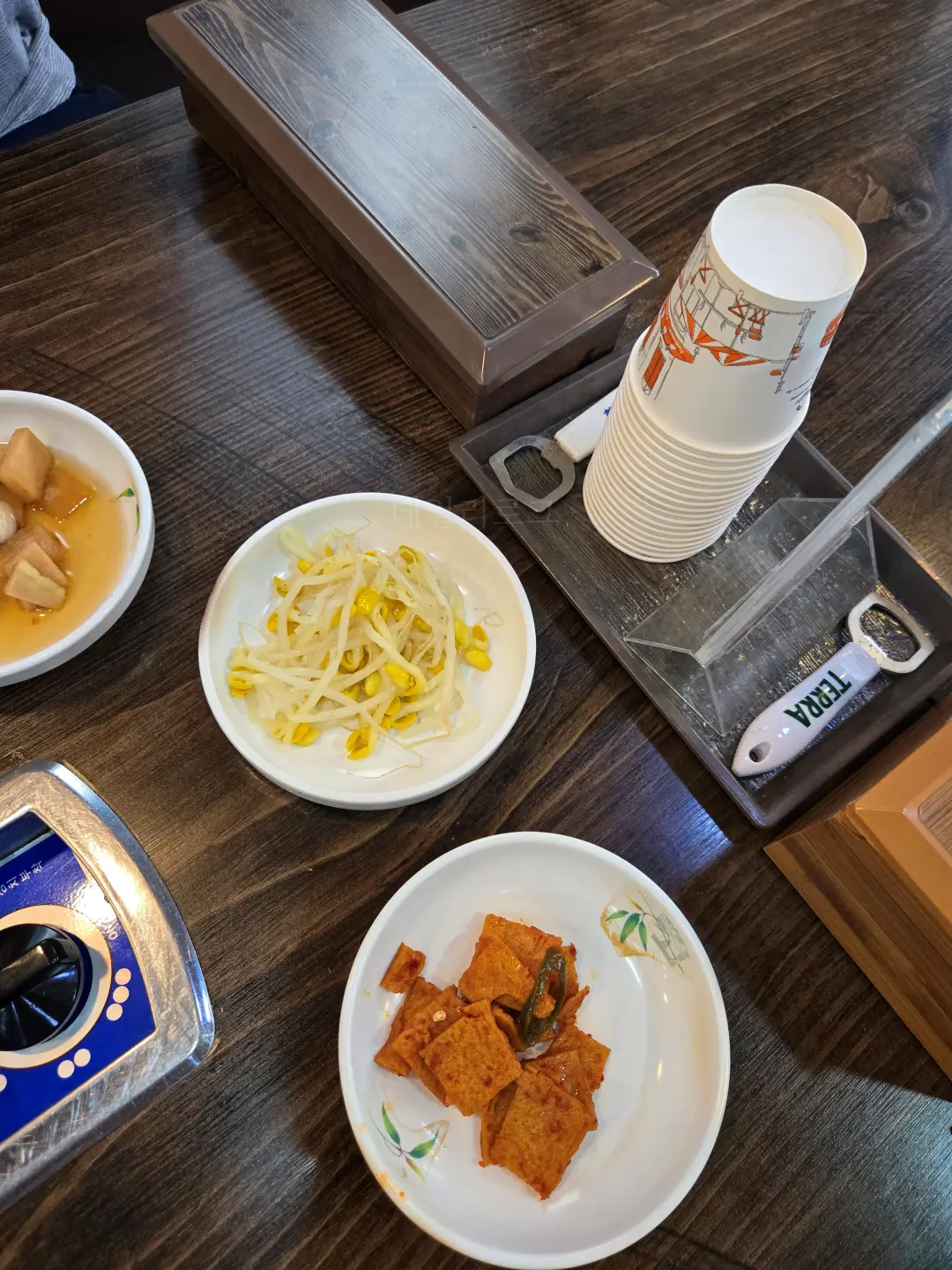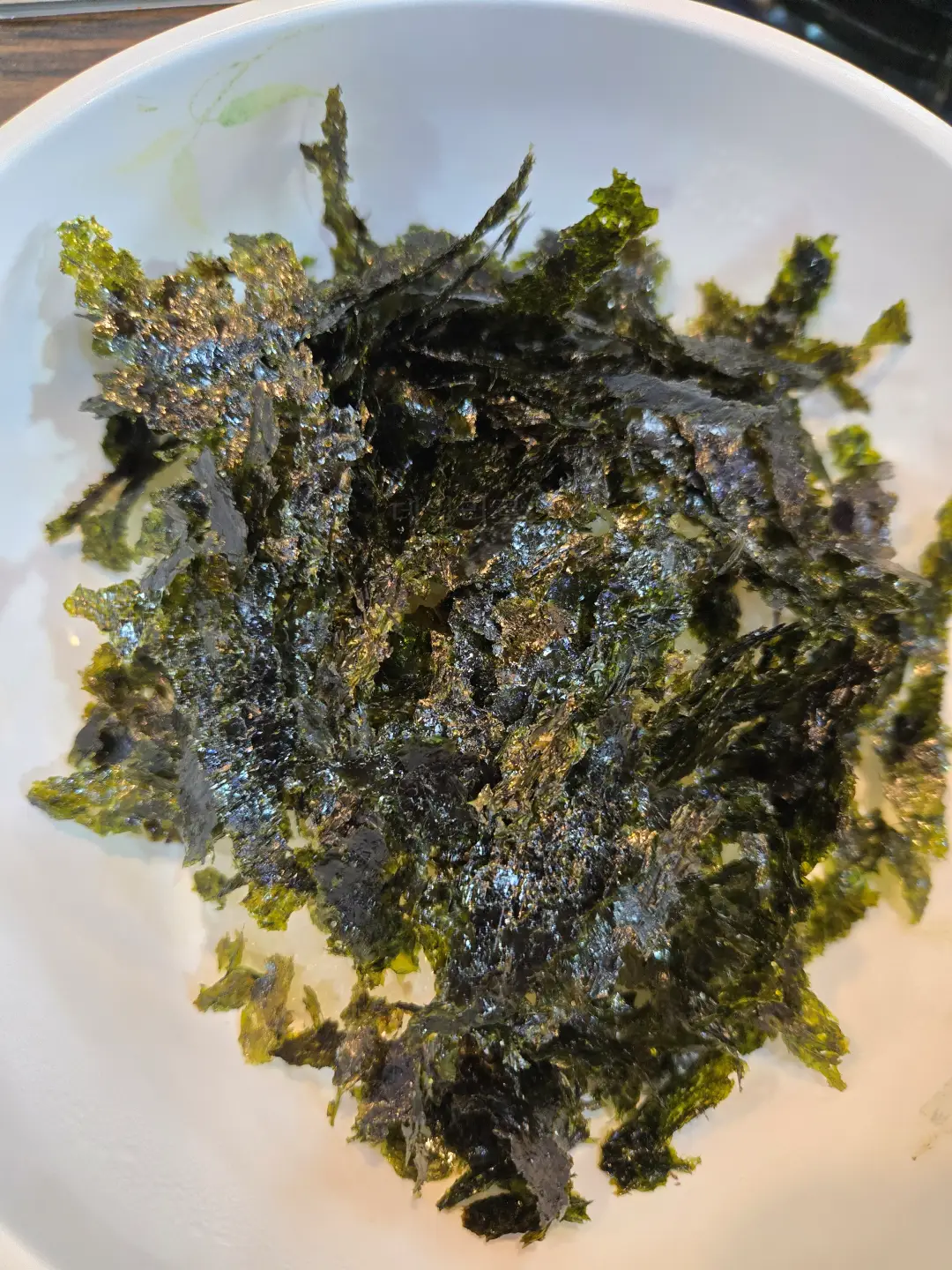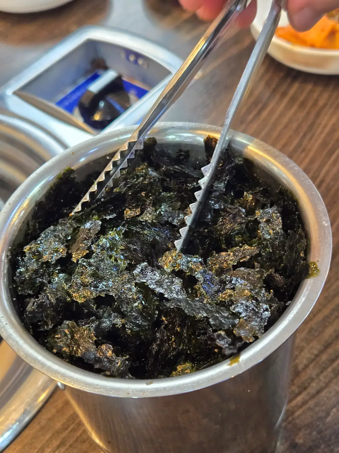 1인 1 밥이 세팅되고 밥에 김 미리 비벼놓고 기다리기~ 밥은 리필이 가능한데 제가 항상 다 못 먹어서 받자마자 큰 한 숟갈 정도는 신랑에게 넘겨주는 편이라 리필을 해본 적은 없네요. 어느 정도 먹고 나서 사리 넣어 먹으니까 밥은 주는 만큼 먹을 수 있어요. 자주 선택하는 건 라면 사리인데 볶음으로 드신다면 볶음밥을 추천해요!