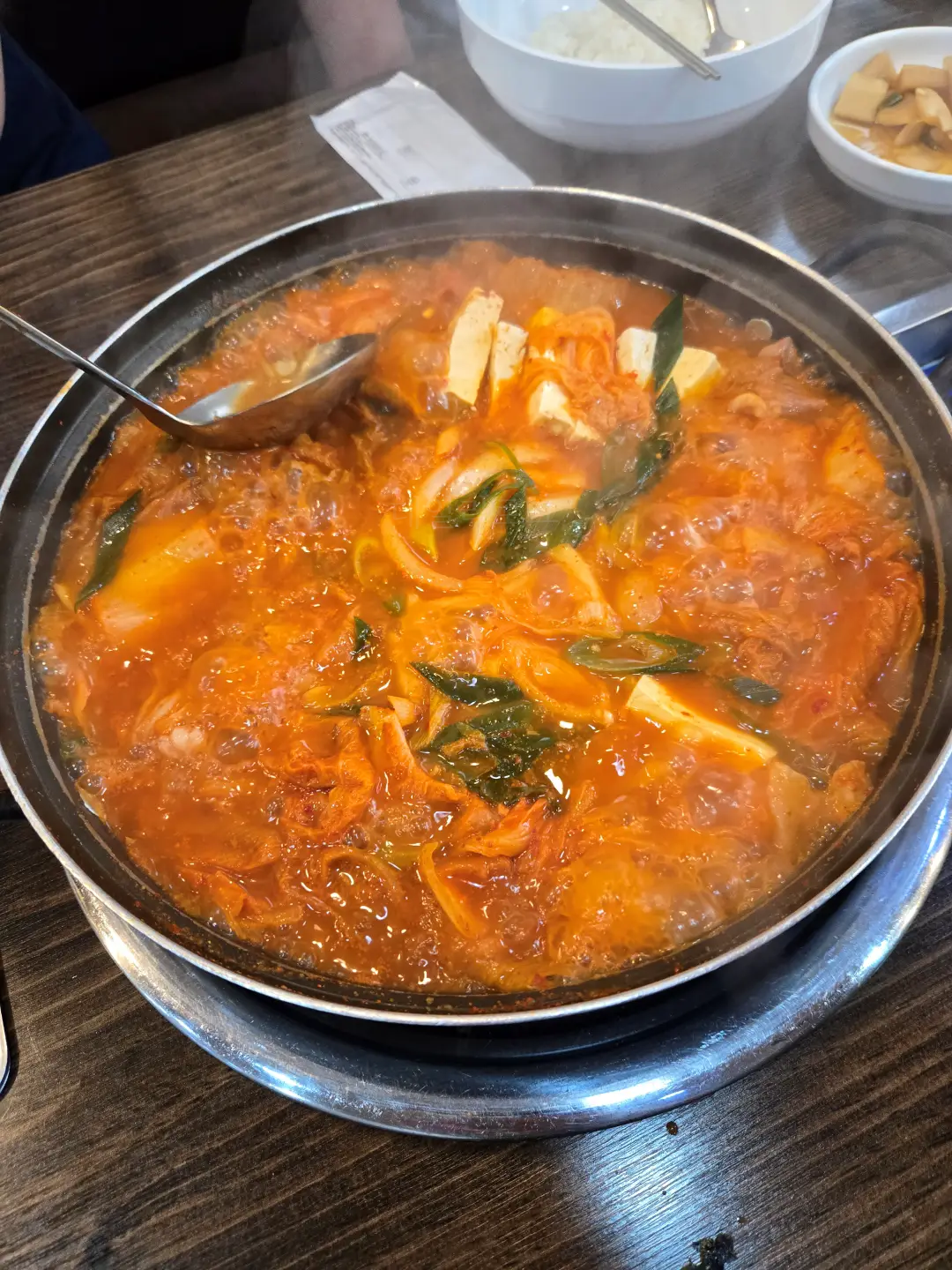 얼마 지나지 않아 맛있는 냄새와 함께 끓여지는 찌개! 시골통돼지볶음 양산물금점에 나오는 찌개는 양도 푸짐하지만 들어가는 재료도 많은 편이라 4명이서 먹고도 충분해요. 여기에 사리까지 넣는다면 최고~ 5분정도 끓여서 김치랑 국물은 어느정도 맛이 나지만 여기서 조금 더 끓이면 찐으로 맛있는 김치찌개를 맛볼 수 있어요. 고기까지 완벽하게 익어줘야 제 맛이 나거든요.