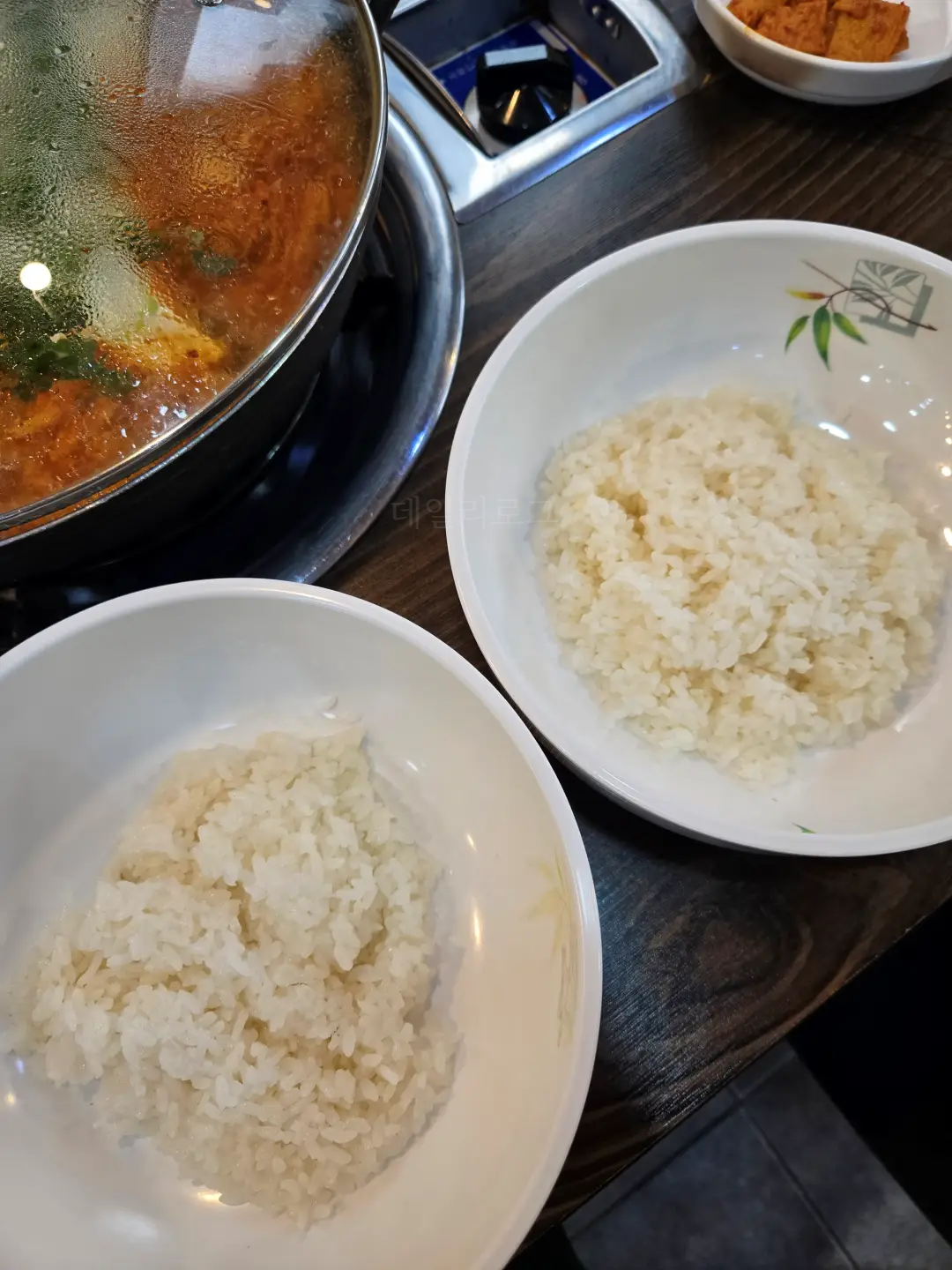 1인 1 밥이 세팅되고 밥에 김 미리 비벼놓고 기다리기~ 밥은 리필이 가능한데 제가 항상 다 못 먹어서 받자마자 큰 한 숟갈 정도는 신랑에게 넘겨주는 편이라 리필을 해본 적은 없네요. 어느 정도 먹고 나서 사리 넣어 먹으니까 밥은 주는 만큼 먹을 수 있어요. 자주 선택하는 건 라면 사리인데 볶음으로 드신다면 볶음밥을 추천해요!