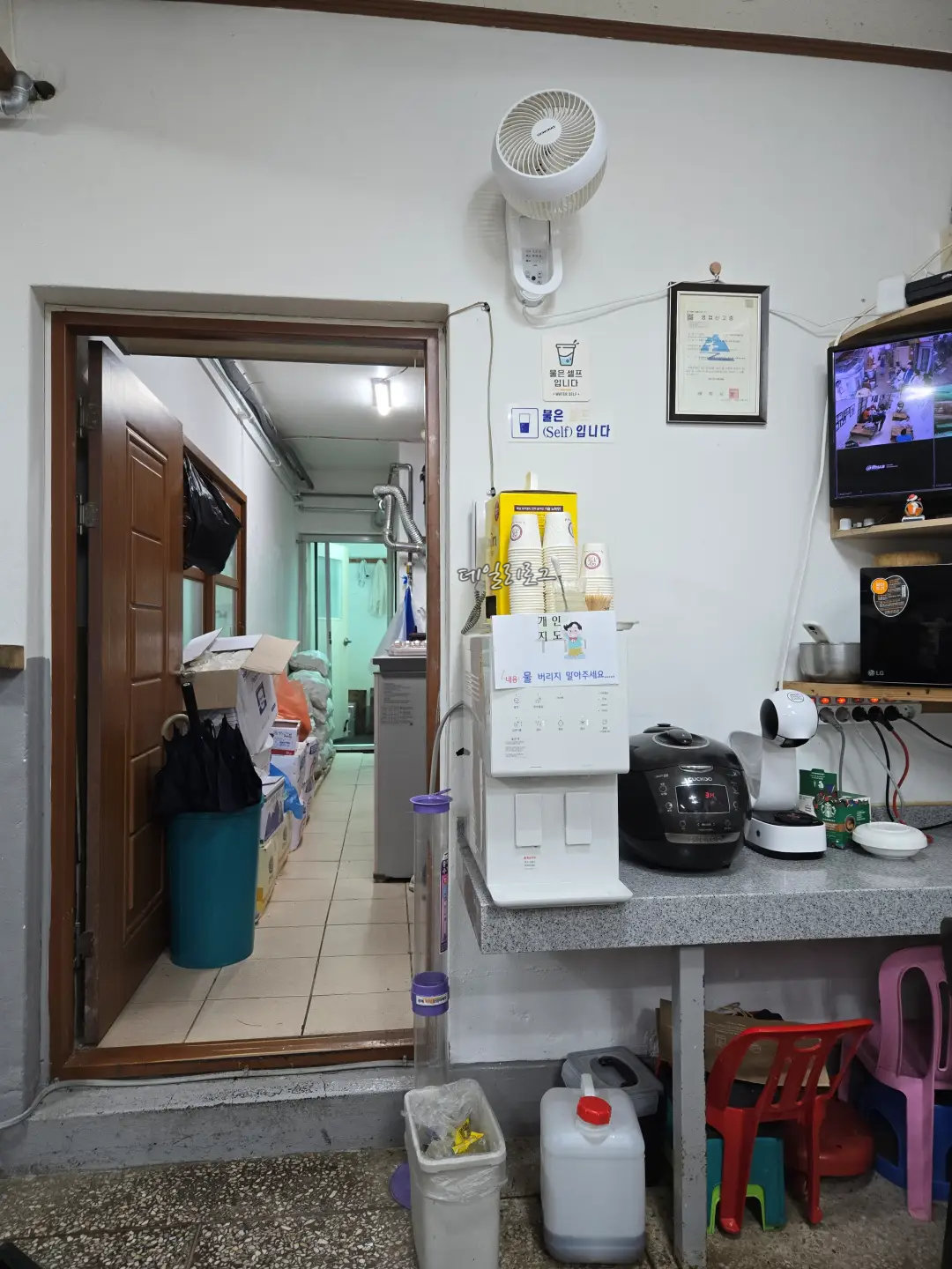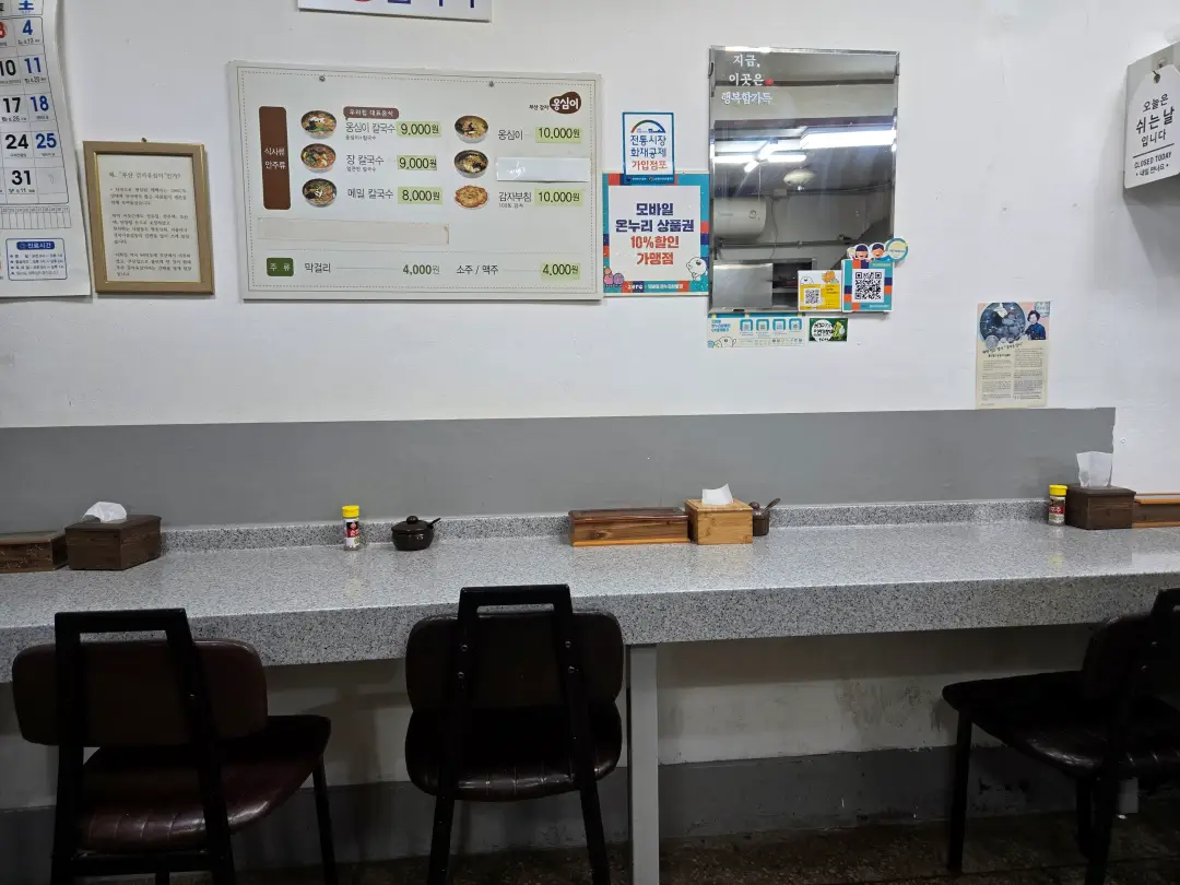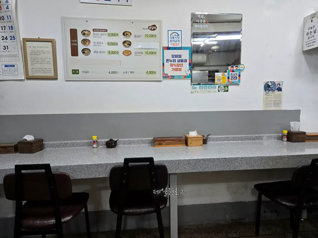 입구에 들어오면 이정표가 바로 보이는데요. 이정표 따라 원하는 맛집을 찾아갈 수 있어요! 저희는 부산감자옹심이로 직행했지요. 도착해보니 벌써 몇몇의 사람들이 가득했는데 웨이팅은 금방 빠졌어요. 내부가 넓진 않아도 몇 개 없는 메뉴라 그랬던 것 같아요. 가게 바로 앞 큰 솥에서 국물을 우려내시는데 냄새가 너무 좋았어요.