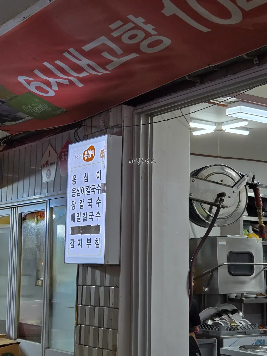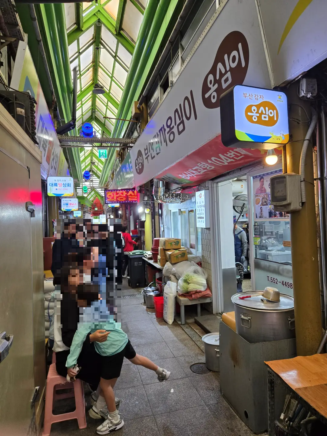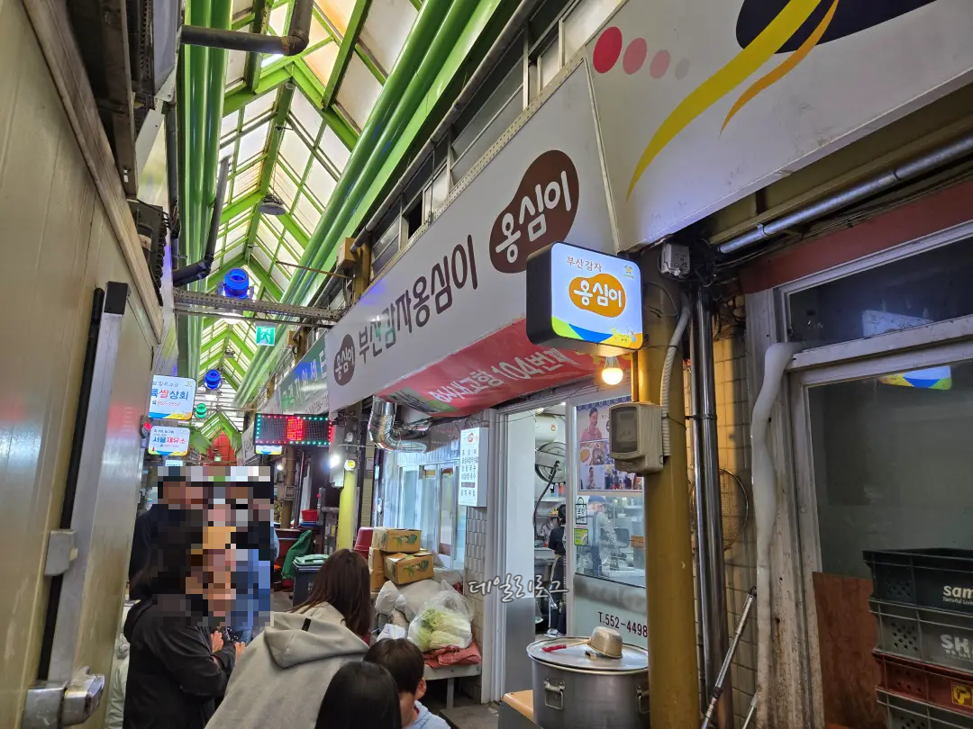 입구에 들어오면 이정표가 바로 보이는데요. 이정표 따라 원하는 맛집을 찾아갈 수 있어요! 저희는 부산감자옹심이로 직행했지요. 도착해보니 벌써 몇몇의 사람들이 가득했는데 웨이팅은 금방 빠졌어요. 내부가 넓진 않아도 몇 개 없는 메뉴라 그랬던 것 같아요. 가게 바로 앞 큰 솥에서 국물을 우려내시는데 냄새가 너무 좋았어요.