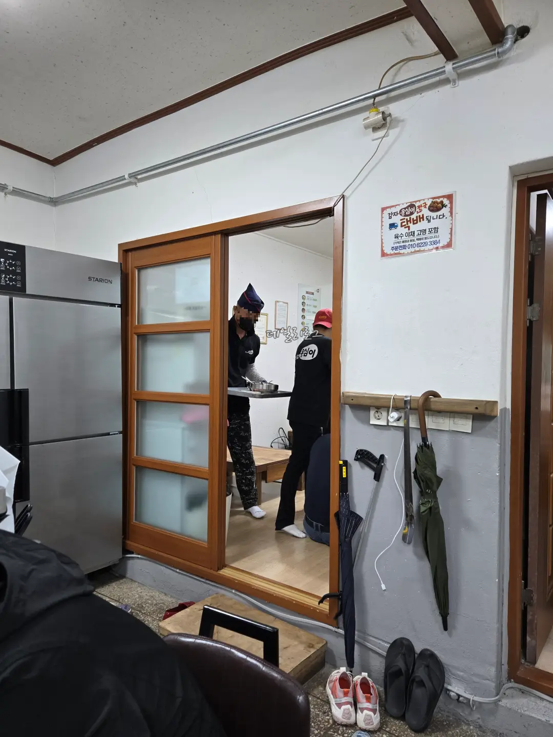 부산감자옹심이의 내부에요! 1층에는 바 형식의 테이블과 좌식형태의 방 1개, 홀 테이블 1개가 있고 오픈형 주방이라 분주한 직원분들과 사장님들의 모습이 잘 보였어요.