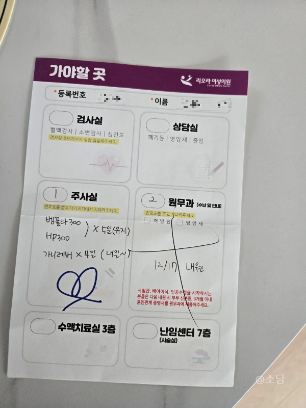 생리 1일 차에 카카오톡으로 연락을 하면 예약 일정을 잡을 수 있었다. 보통 2-3일 차에 내원하는데 나는 3일 차에 주로 가는 편. 2일 차에 가면 양도 많아 불편하고 주사 시작이 3일 차부터 하기 때문이다. 초음파를 보고 그에 맞춰 진료 일정이 정리되었고 이전 병원과 비교했을 땐 여기가 엄청 적극처방이라는 점이었다.