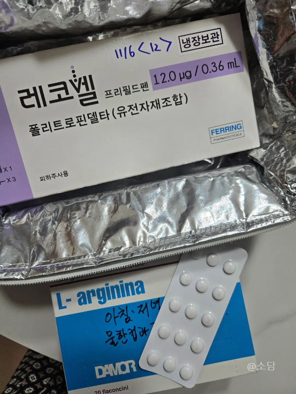 생리 2-3일차 방문 후 3번의 내원을 더 하면서 받았던 과배란 주사와 영양제들. 처음에는 레코벨과 IVFM-HP만 맞았고 이어지는 일정에 맞춰 주사가 추가되기도 한다. 내가 받았던 영양제는 바이오아지니나액으로 아르기닌이라 생각하면 쉽다. 잠을 편하게 자기 위한 약도 처방받아서 아르기닌은 하루 2번, 잠자는 약은 하루 1번씩 먹었다.